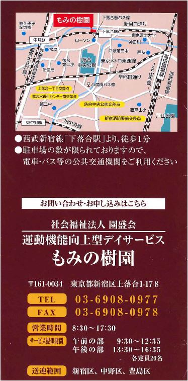 スタッフ一同 心よりお待ち申し上げます。宜しくお願い致します。 デイサービスセンター もみの樹園 (通所介護・デイサービス) 03-6908-0977 アクセス 東京都新宿区上落合1-17-8 ・ 西武新宿線 下落合駅から徒歩で1分 ・ 西武新宿線 中井駅から徒歩で11分 |
